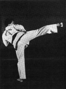 18. Execute a right ball of foot turning kick to DF and then lower it to F.